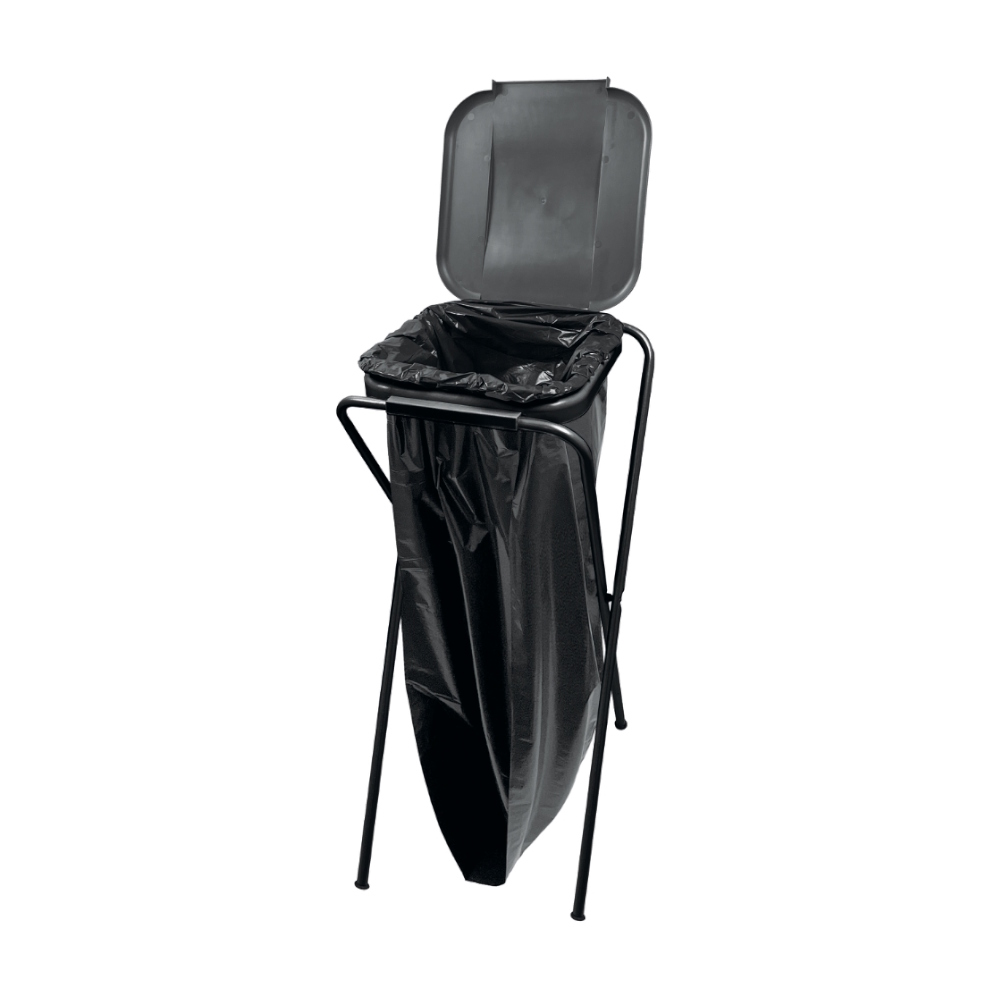 Bag holder with practical plastic lid, suitable for plastic bags from 60-125 liters.