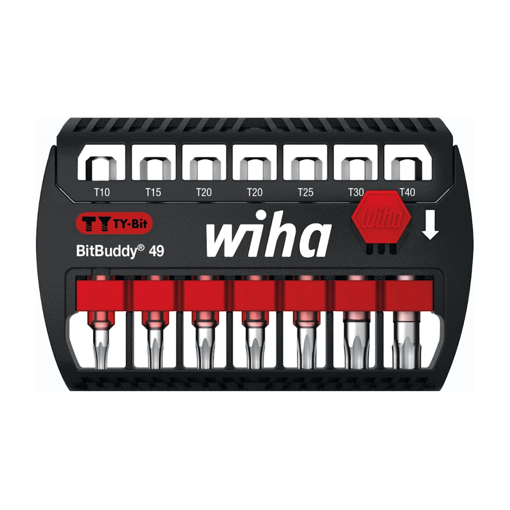 Bit set TY-bits Torx 49 mm 7-piece 1/4". Wiha BitsBuddy makes it possible to attach the bits directly to the machine and it is just as easy to put them back into the holder. The placement of the bits in the holder and the lasered profile size on the bit base make it really easy to choose the right size when removing the bit.
