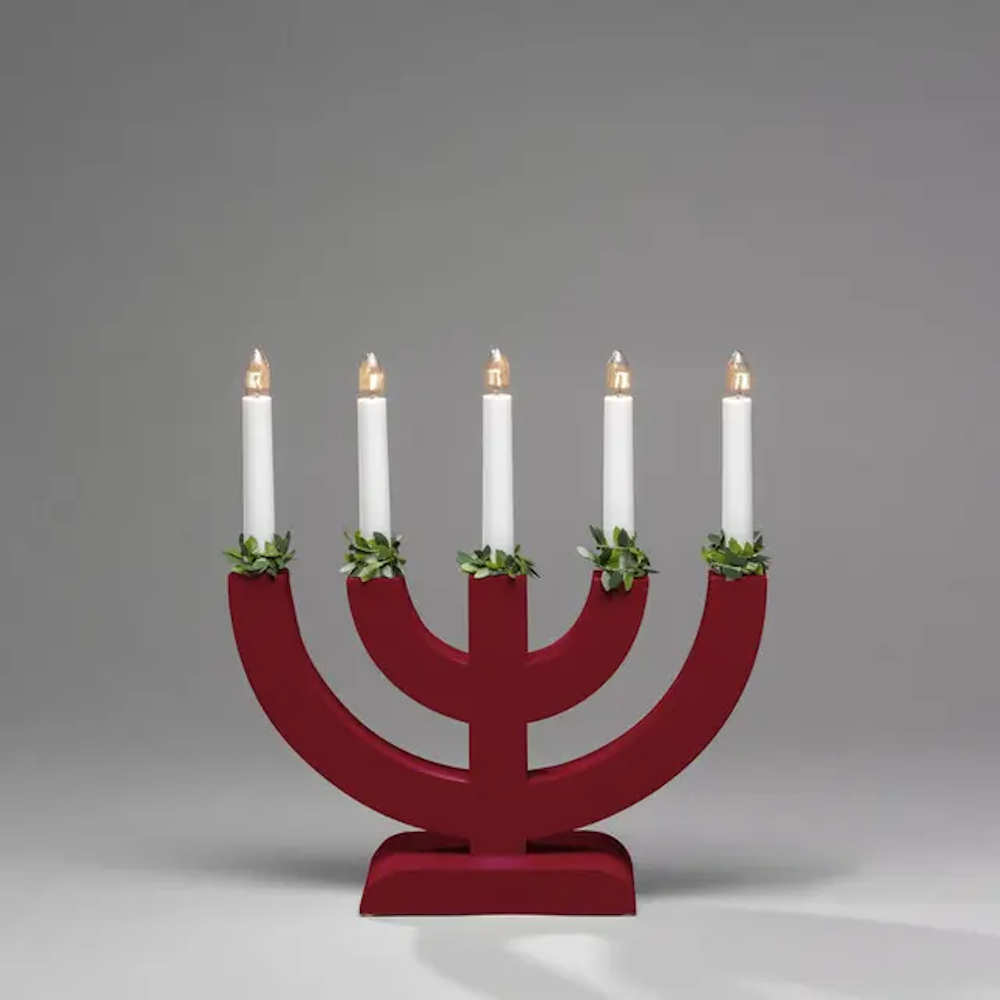Candlestick 5 lights, E10, IP20, in wood – Red. Warm white lighting, dimmable with cord switch.