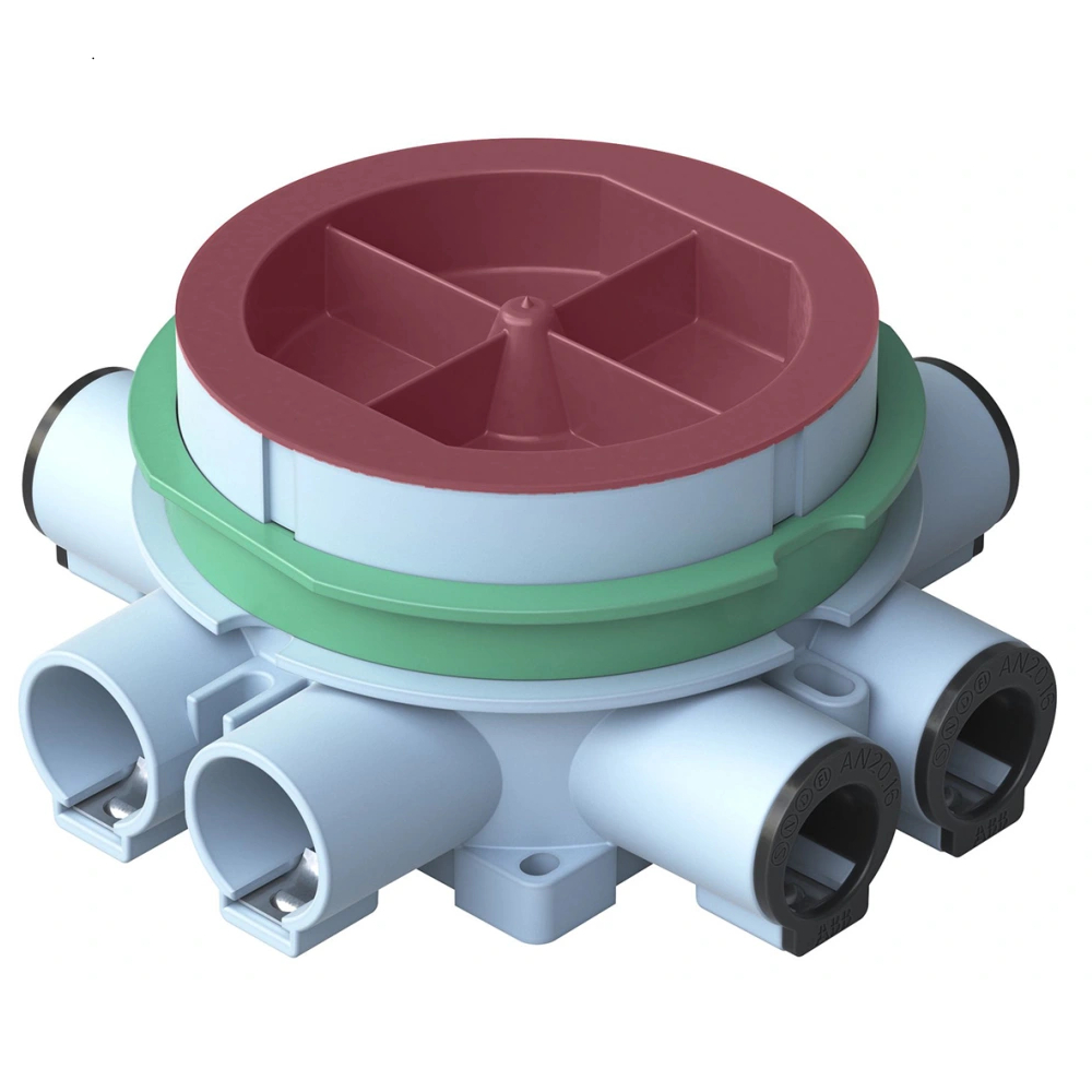 Ceiling box for single and double plasterboard. Screw distance cc70mm With 8 fixed connectors 20mm. 6 have reducing connectors to 16mm. The ceiling box has two screw posts for M4 screws with a screw distance cc70mm. The supplied green spacer ring is used for single-panel (13mm). The ring is removed when the box is mounted in a ceiling with double-panel (26mm). The box has 8 fixed connectors for 16/20mm pipes. 6 of these are equipped with reducers to 16mm. In addition, there are two cutouts in the bottom of the box. Suitable bottom connectors 6410011527146, 6410011527184, 6410011527214. Made of halogen-free material (IEC/61249-2-21) and meets the requirements of the glow wire test according to standard IEC/EN60670:2005 (850°C). The box's cleaning lid is made from recycled plastic.