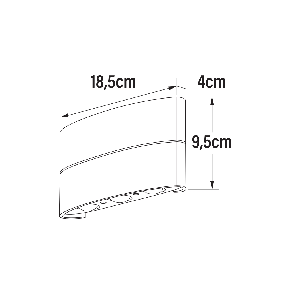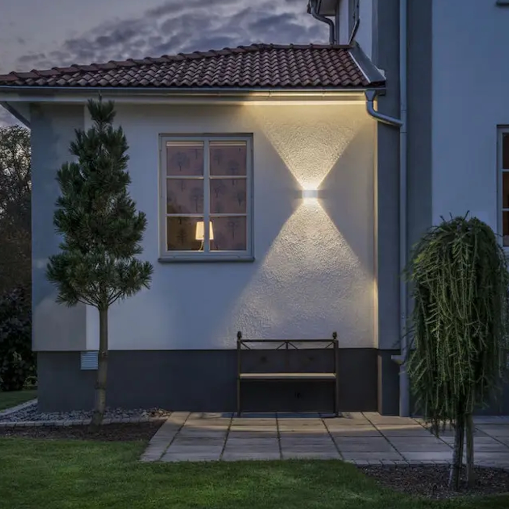The wall light LED is a stylish facade lighting that shines both upwards and downwards, creating beautiful shadows on the wall. [Energiklass G]