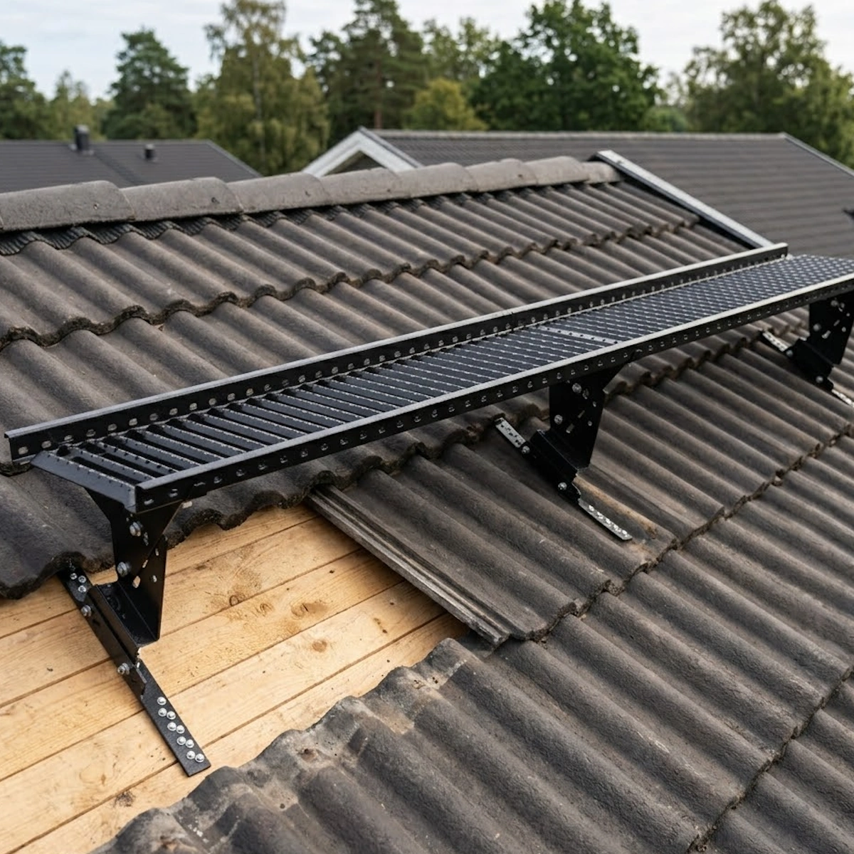 Maximize safety on the roof with our complete roof platform package. This solution is specially developed for concrete tiles (BTG) with attachment to raw sheet pile. Thanks to its modular design, several units can be easily combined to achieve exactly the length your project requires.