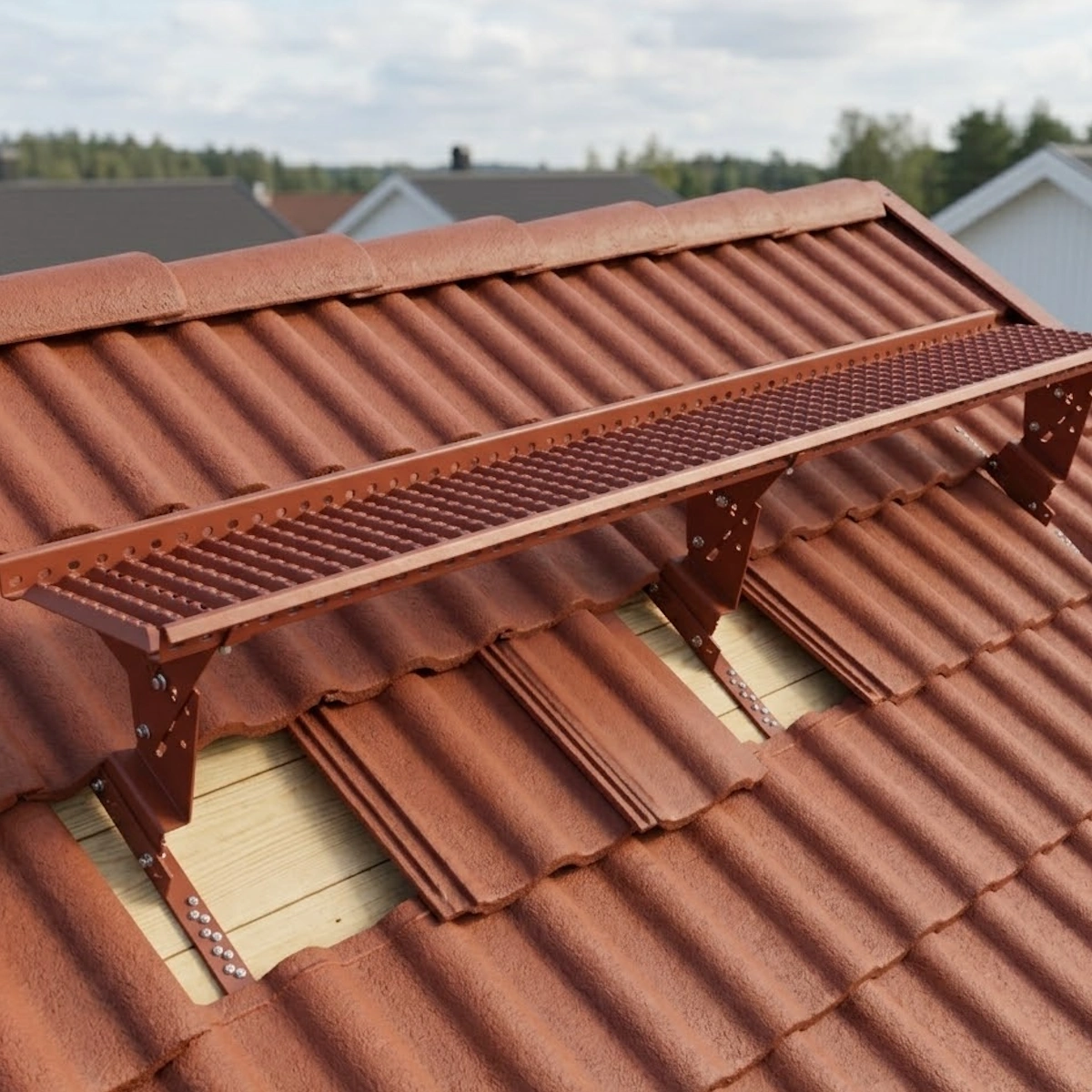 Maximize safety on the roof with our complete roof platform package. This solution is specially developed for concrete tiles (BTG) with attachment to raw sheet pile. Thanks to its modular design, several units can be easily combined to achieve exactly the length your project requires.