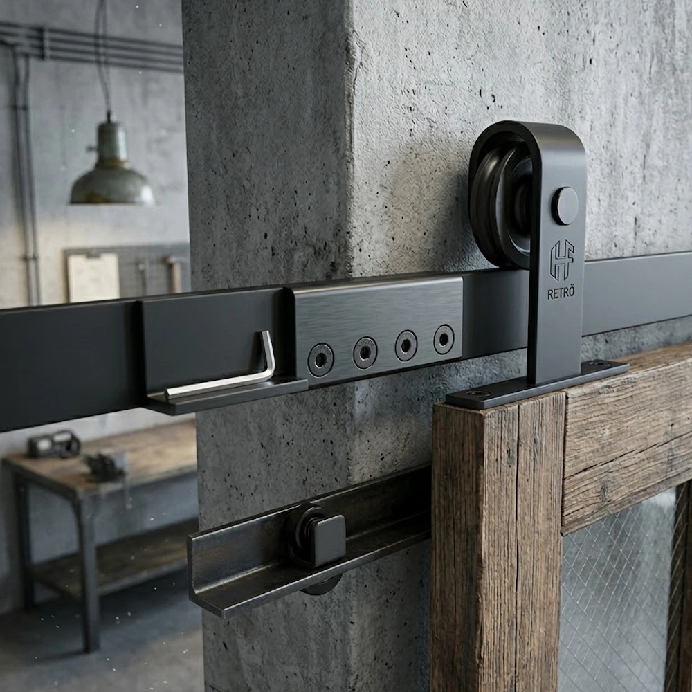 Connector for easy and stable connection of two rails in Helaform's Retrö series, Provides a seamless transition for sliding doors in a classic style.