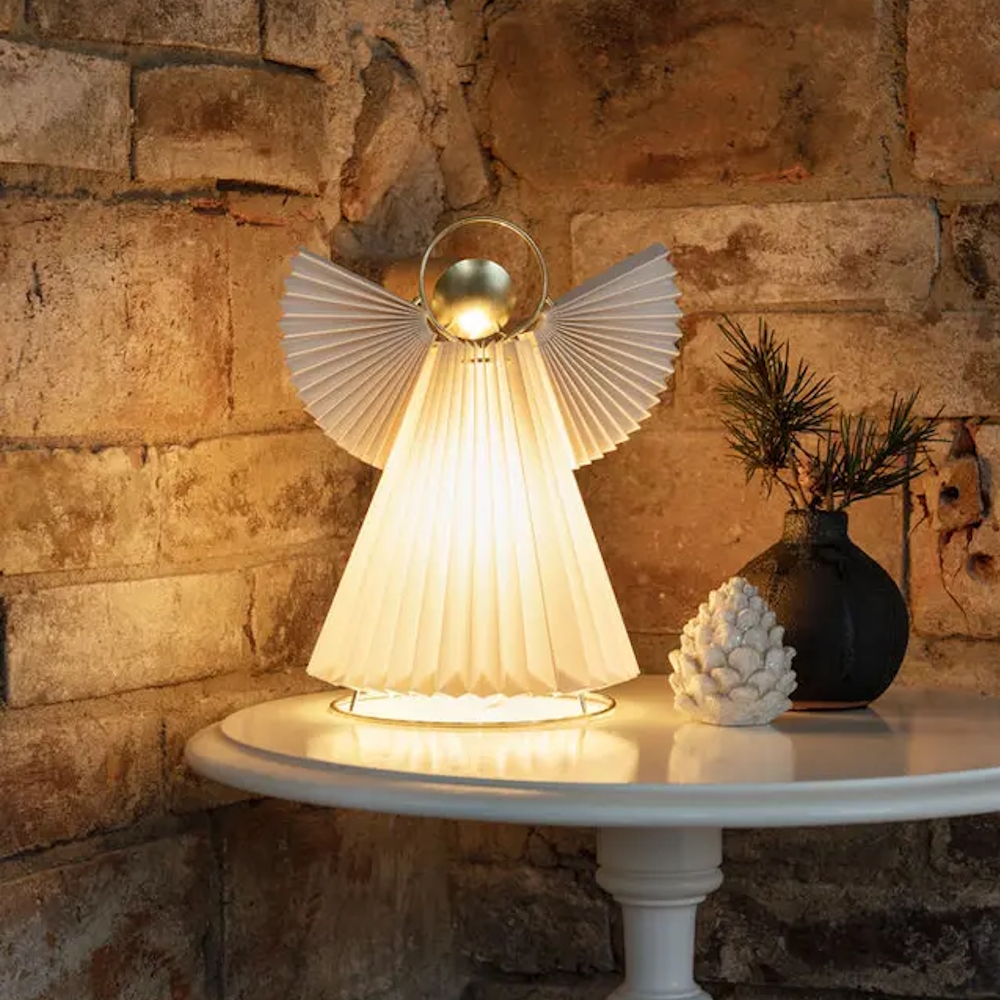 Angela S an atmospheric angel in pleated white paper with elegant brass-colored details, she becomes a cozy decoration that spreads a soft glow.