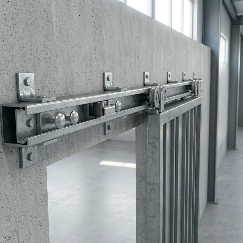 Robust and quick-mounted door stop adapted for rail, It provides an effective and safe stop for heavier doors and gates in industrial environments.