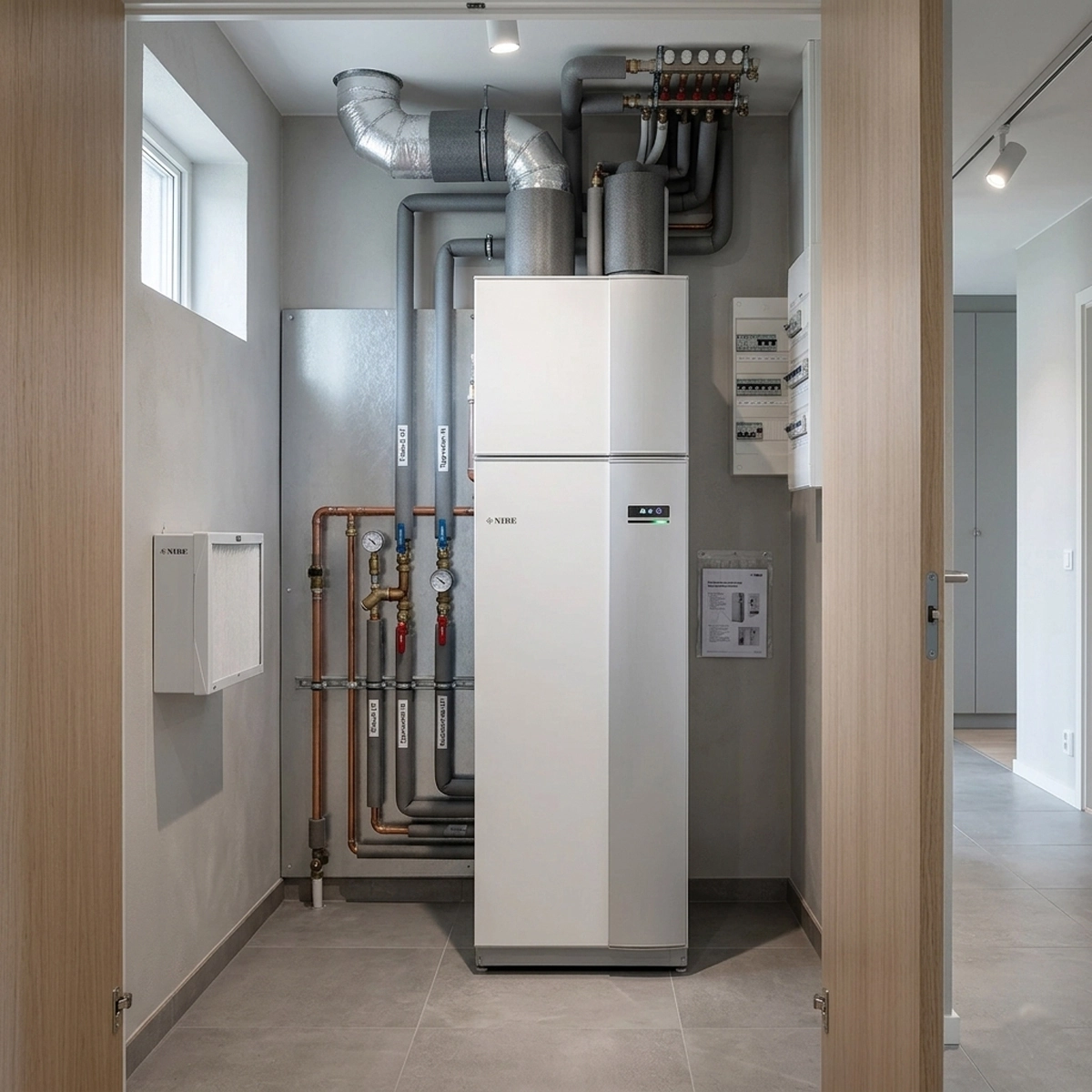 NIBE F730 is an intelligent exhaust air heat pump. Efficiently, simply and economically, the NIBE F730 meets the need for heating, ventilation, heat recovery and hot water. With a stylish, clean design and a compact format, the heat pump is easy to place and install both in new construction and replacement of an existing heat pump.