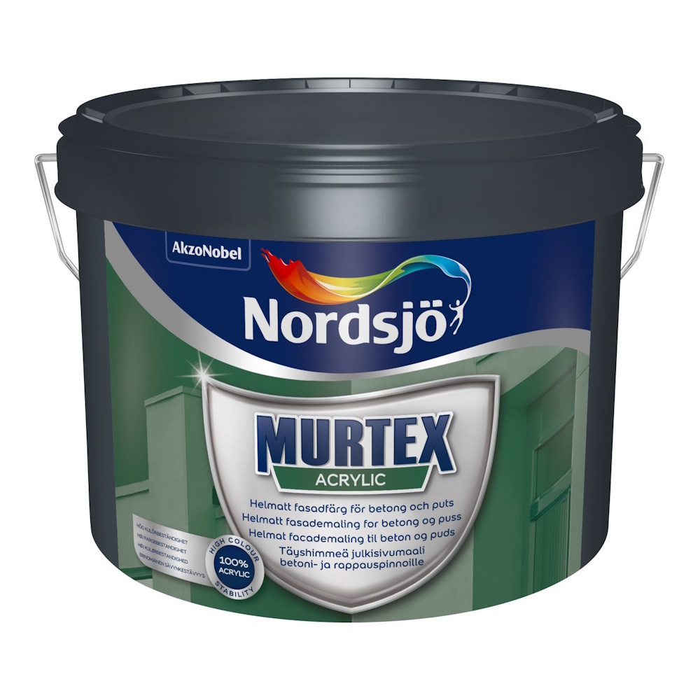 Murtex Acrylic is a full matt facade paint, primarily intended for painting on concrete and lightweight concrete. It can also be used on plaster and fibre cement. The substrate must be solid and clean of dirt, grease and similar contaminants. Absorbent surfaces must be primed with Murtex Hydro Primer. Finish painting 2 times with Murtex Acrylic. Stir thoroughly in the can. Never paint below +5°C or at a high relative humidity (above 80%).