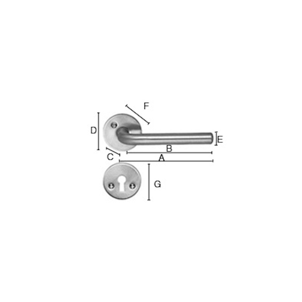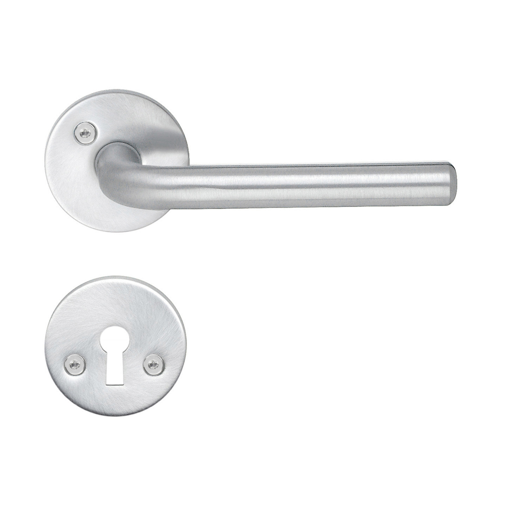 Stylish interior door handle in a modern look. The affordable handle has a round design and a matte surface in brushed chrome.