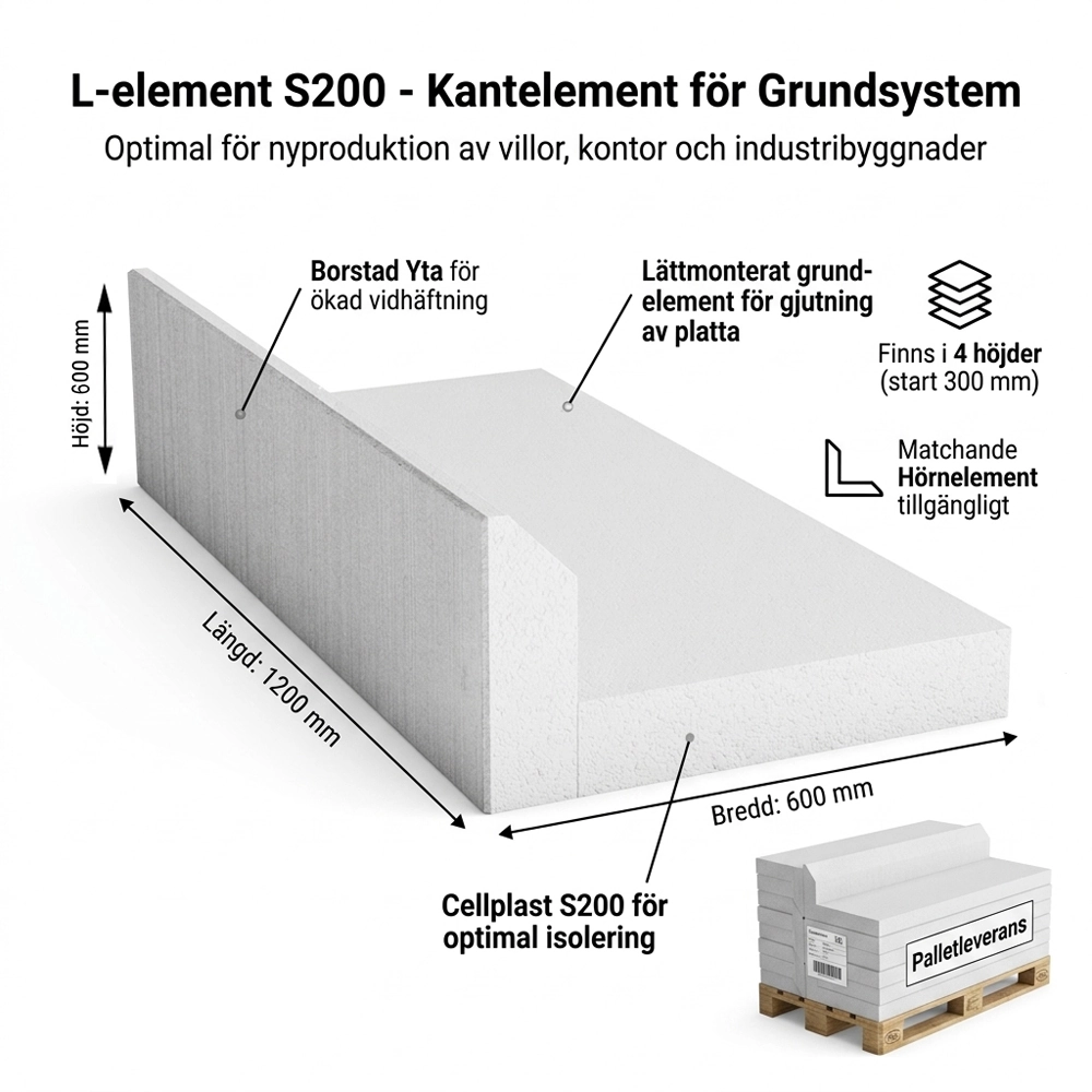 Ska du gjuta grund till villa, garage eller industribyggnad? L-element S200 är ett högkvalitativt kantelement speciellt framtaget för nyproduktion av stabila och välisolerade grunder. Med sin borstade betongyta och kärna av högklassig cellplast ger det både en estetiskt tilltalande sockel och en tekniskt överlägsen konstruktion.