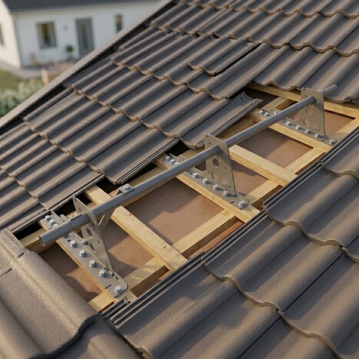 Lifeline attachment concrete tiles 0.7m for mounting on lath, includes brackets, footplates, pipe strut, safe roof maintenance concrete tile roofs.