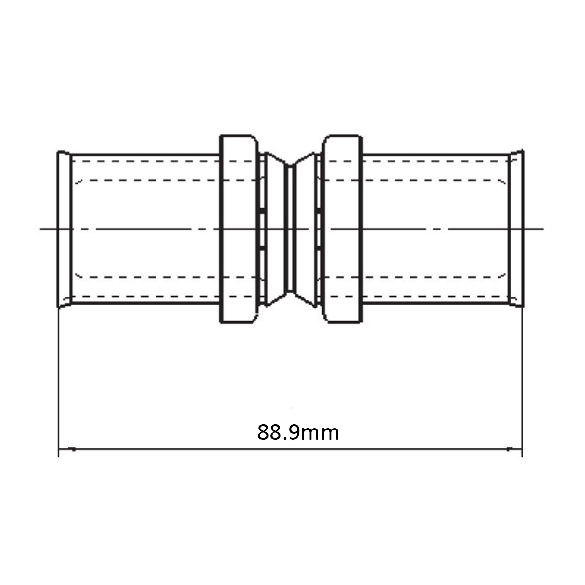 Straight PressPex coupling A50 with two press sleeves for LK PAL and PE-X Universal pipes. In DZR brass, with leak indication unpressed.