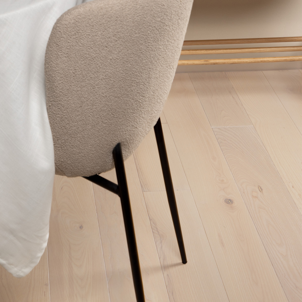NoblesseAsh Tin är ett massivt askgolv med inslag av kärnved vilket gör golvet rikt på färgvariationer. Ask är ett mycket hårt träslag och NoblesseAsh Tin har ytbehandlats med Osmo dekorvax 3111 och Osmo matt hårdvaxolja 3062 för att få rätt finish och slitstyrka.
