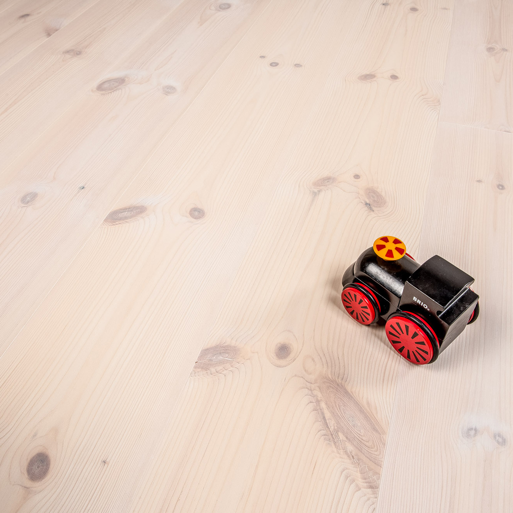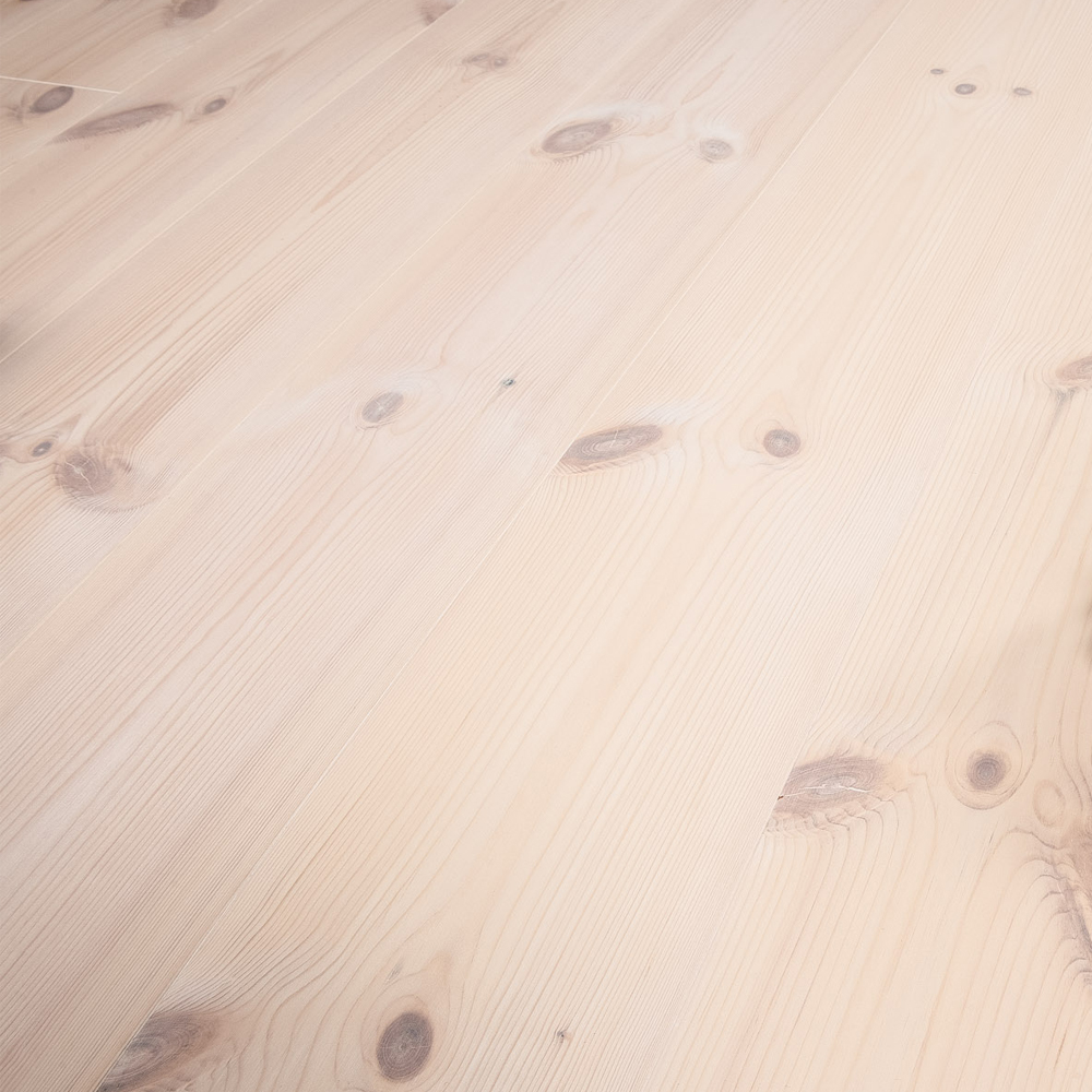 SoftPine Pearl är ett massivt och vittonat furugolv med kvistar i varierande storlek och struktur. A-kvalitet 1:a sortering.