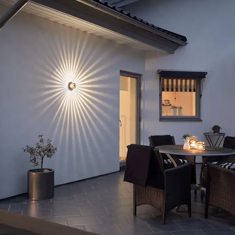 Monza facade lighting with High Power LED, in brass-colored aluminum an effective and modern outdoor lamp where the light image radiates. Also works well indoors. E27 socket. Light source included.