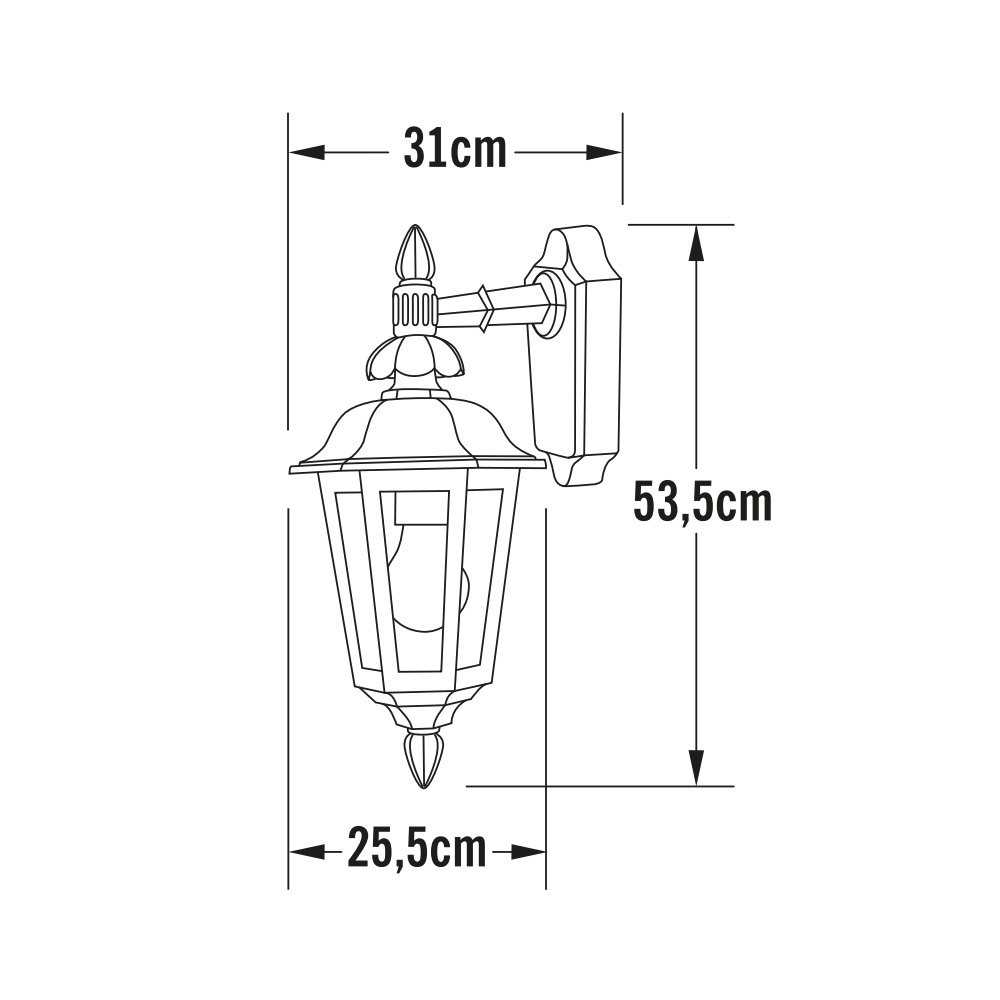 Pallas Wall Lamp Down E27 black is a stylish and well-built outdoor lamp in classic lantern style. Made of black matt lacquered aluminum with IP23 protection and E27 socket. The lamp is robust, durable and has a timeless design that is perfect for outdoor areas and entrances. Light source not included, and you can choose a dimmable variant if desired. Its dimensions of 25.5cm×31cm×53.5cm make it an eye-catching but discreet addition to the facade.