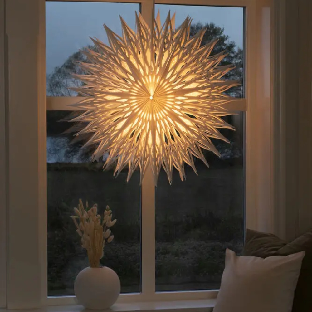 Advent star in white with a shape reminiscent of a snowflake or a flower. Cord stand with E14 socket included (light source not included) Diameter 78 cm. 5 meter connection cord with cord switch.