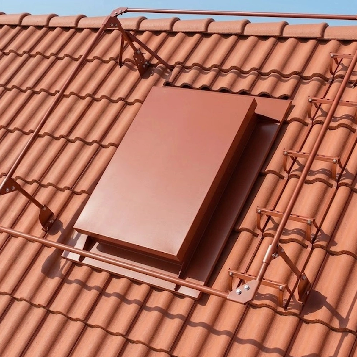 Complete safety railing brick red for roof hatch on concrete tiles, safe fall protection for raw sheet piles, buy certified roof safety here.