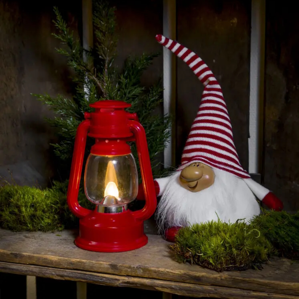 Red battery-operated lantern with warm white LED light, an atmospheric detail that is perfect as a decoration or to light up Santa's path.