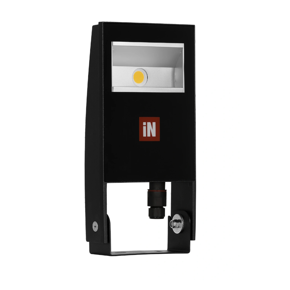 Black housing in die-cast aluminum. Tempered flat glass, aluminum clip. Optics in pure aluminum. Asymmetric light pattern reflector. Luminaire has two power settings, set with a button on the back. Black bracket with slot, quick coupling and spirit level for easy installation. Stainless steel screws. Silicone gasket. Terminal block: 3 poles x1.5/2.5mm². Diameter 8-124mm – H07RN . IP67. IK05. Insulation class I.