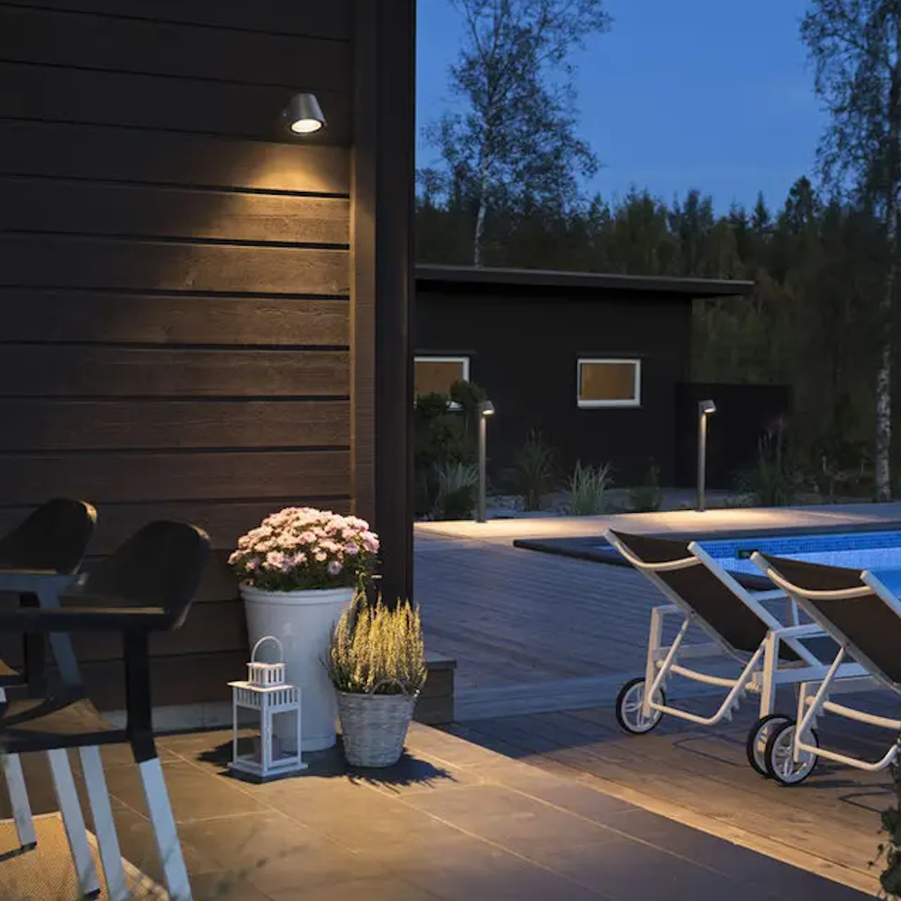 Trieste facade lighting in anthracite grey painted aluminium with clear glass – the light is directed obliquely downwards for an effective light patte