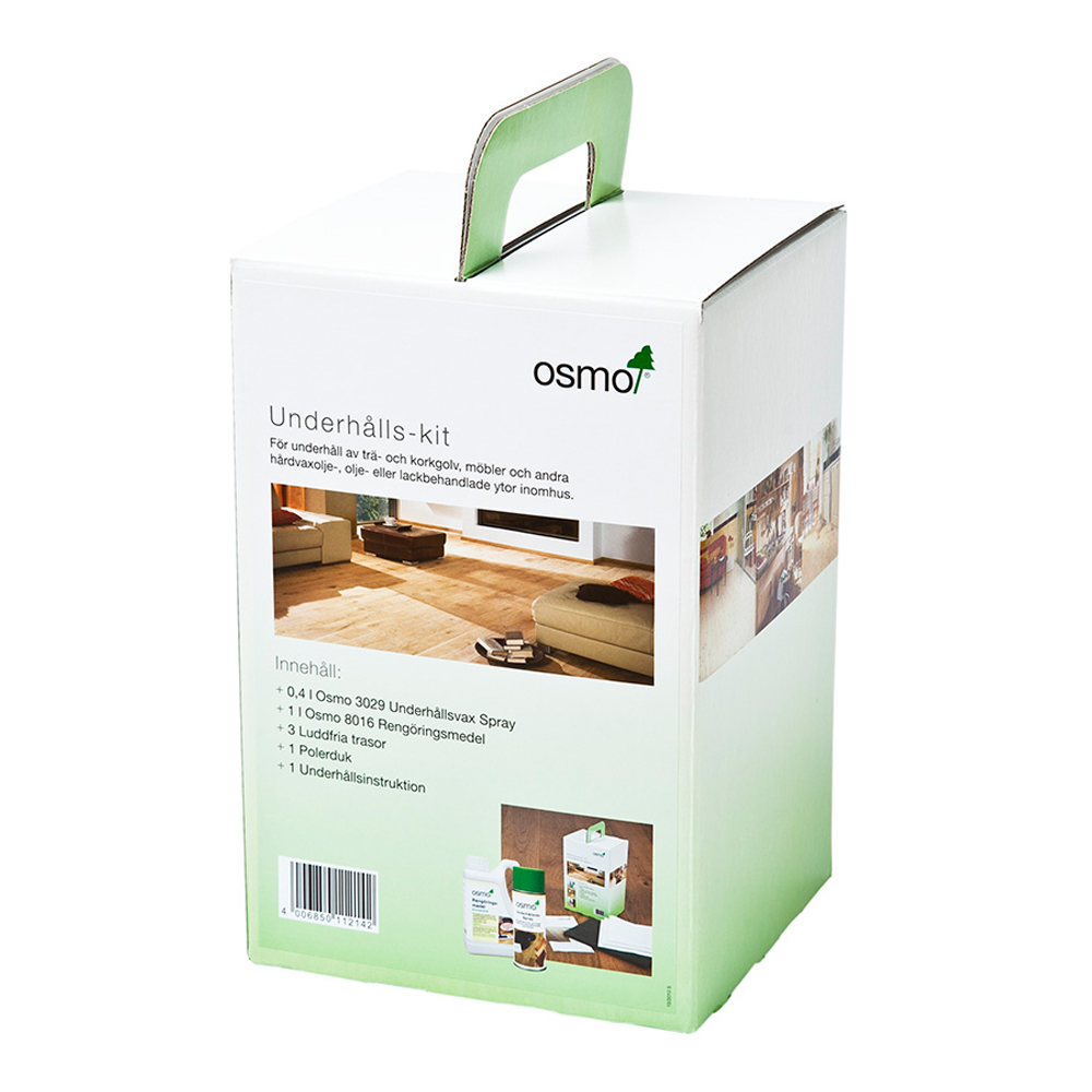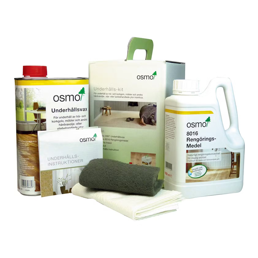 Ett komplett set med produkter för rengöring och underhåll av hårdvaxoljade golv inomhus. Osmo Underhållskit för hårdvaxoljade golv innehåller rengöringsmedel, underhållsvax, luddfria trasor, polerduk och underhållsinstruktion.