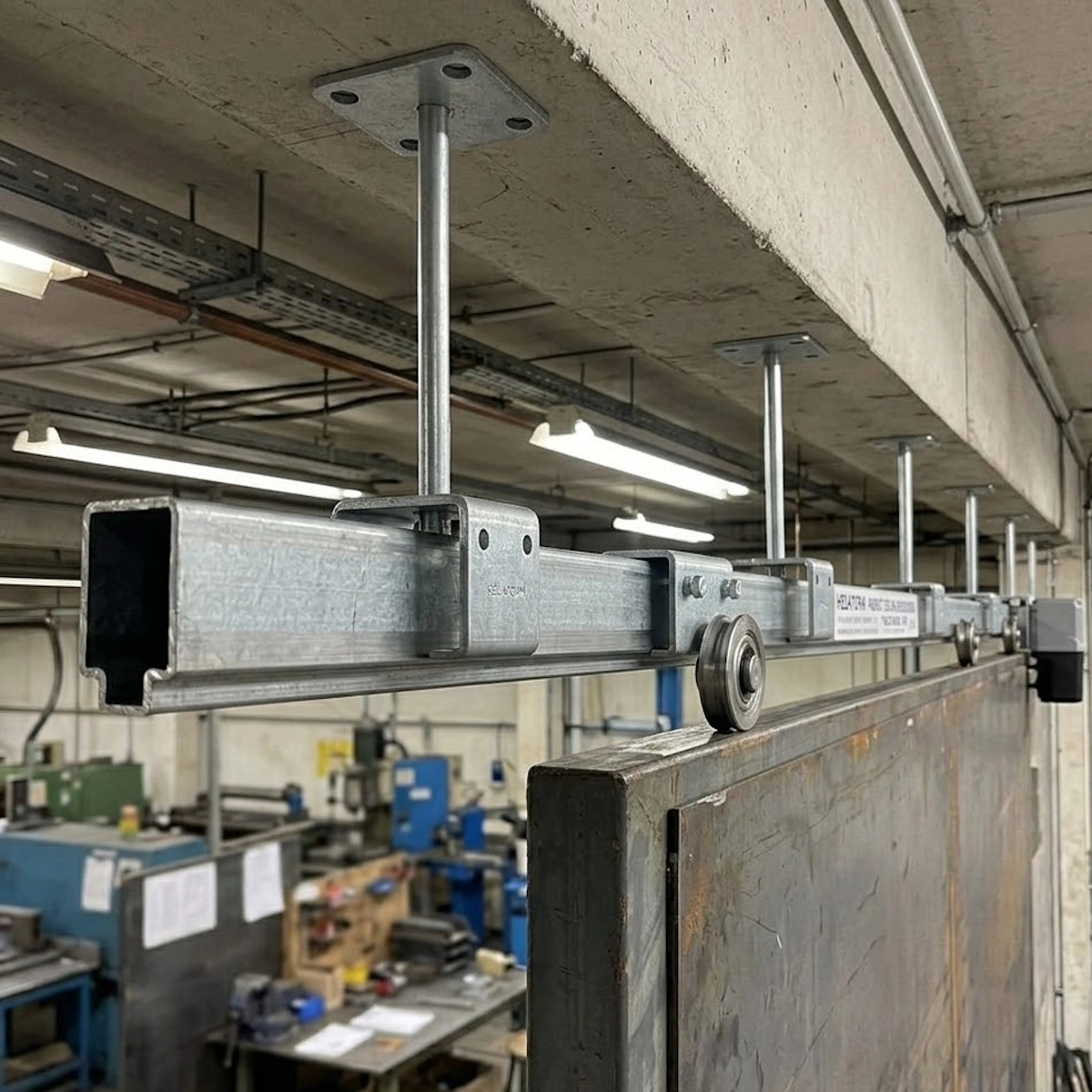 Robust ceiling bracket from Helaform for mounting sliding door tracks, Designed for secure suspension of heavy doors in industrial environments.