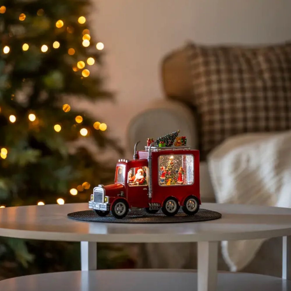 Festive Christmas decoration in the shape of a truck, filled with water with detailed figures. The glitter swirls around like in a snow globe and creates a magical Christmas feeling. With warm white LED lighting, timer function (5 h) and the option to be powered by 3 AA batteries (not included) or via USB. 1.8m USB cable included.