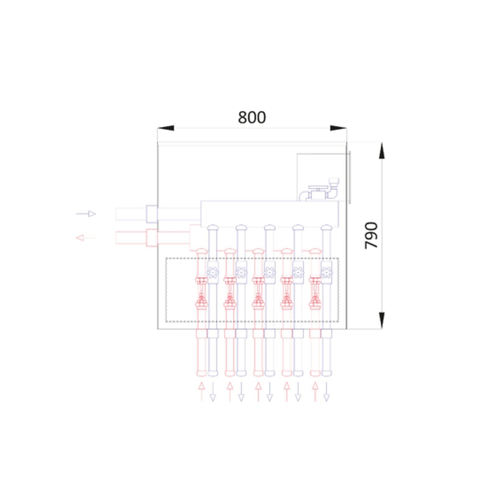 Samlingsskåp för kollektorer. Justerbara termometrar på varje kollektorpar. Alla skåp är isolerade med PU-skum. Alla anslutningsrör har en utstickande längd av 150 mm, förutom väggenomgångarna som är 560 mm. Samtliga kollektorändar är proppade.
