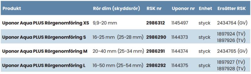 Nya Uponor Aqua PLUS Rörgenomföring ersätter tidigare Uponor Vario Rörgenomföringar för golvvärme och Uponor Aqua PLUS Fördelarskåpsanslutning för tappvatten.
