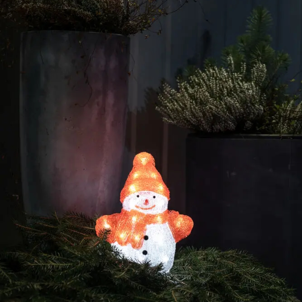 Söt snögubbe med röd halsduk och mössa, i tålig akrylplast. 24 LED-lampor som sprider ett fint varmvitt sken. Perfekt som stämningsfull inomhusdekoration under vinter och jul.
