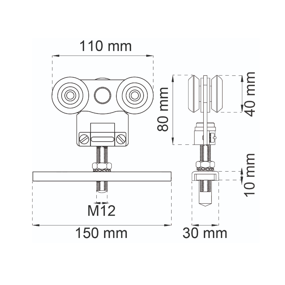 Robust portbeslag för dörrar och portar med en vikt upp till 300 kg.Hjulsatsen innehåller 2 dubbelhjul, 2 mässingsfodrade justerskruvar, 2 bärplattor, 2 ändstopp, 1 bottenstyrning, skruvar och monteringsanvisning. Avsedd för skjutdörrsskena SF-300.