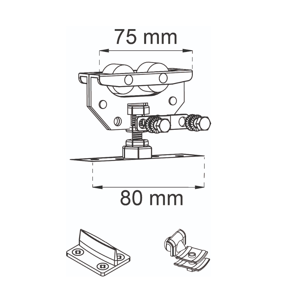 Robust portbeslag för dörrar och portar med en vikt upp till 75kg, avsedd för Skjutdörrsskena SF-75.