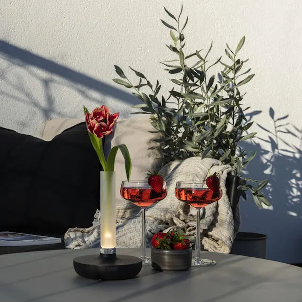 Biarritz är en elegant, uppladdningsbar loungelampa i form av en vas med ställbar belysning där man kan välja färgtemperatur 1800/2700/4000K och är dimbar. Dekorera din dukning med blommor och mysigt ljussken. Laddas via USB och har en batteritid på ca 9 timmar vid full ljusstyrka. Svartlackat rostfritt stål.