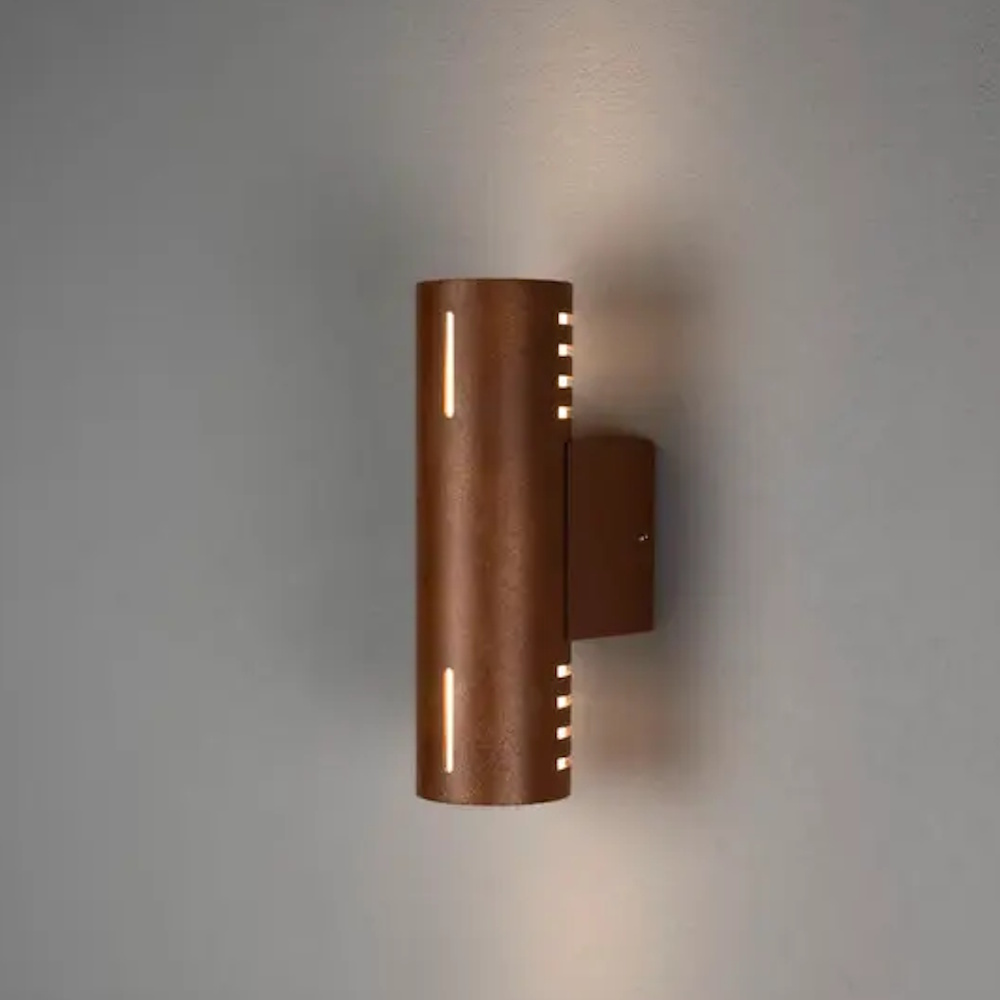 En modern fasadbelysning i rostfärgad aluminium och opalt plastglas, riktas uppåt och nedåt för effektfull ljusbild.