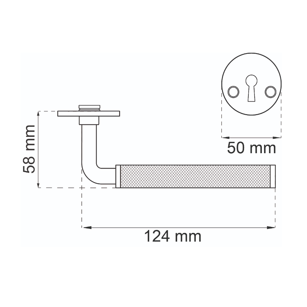 Innedörrhandtag av förkromad mässing. Exklusiv modell med robust industriell karaktär. Komplett med täckbrickor med nyckelhål, inklusive 4st skruvor och Roddarpinne.