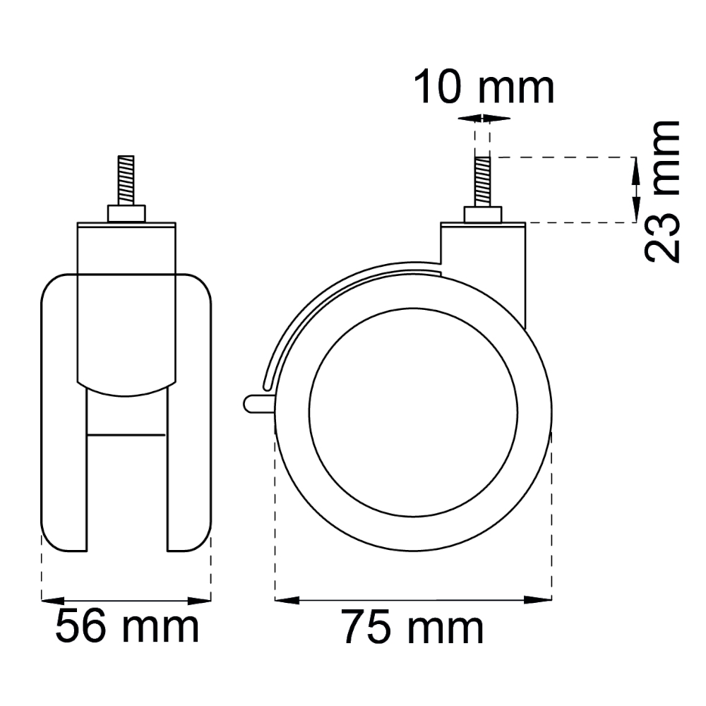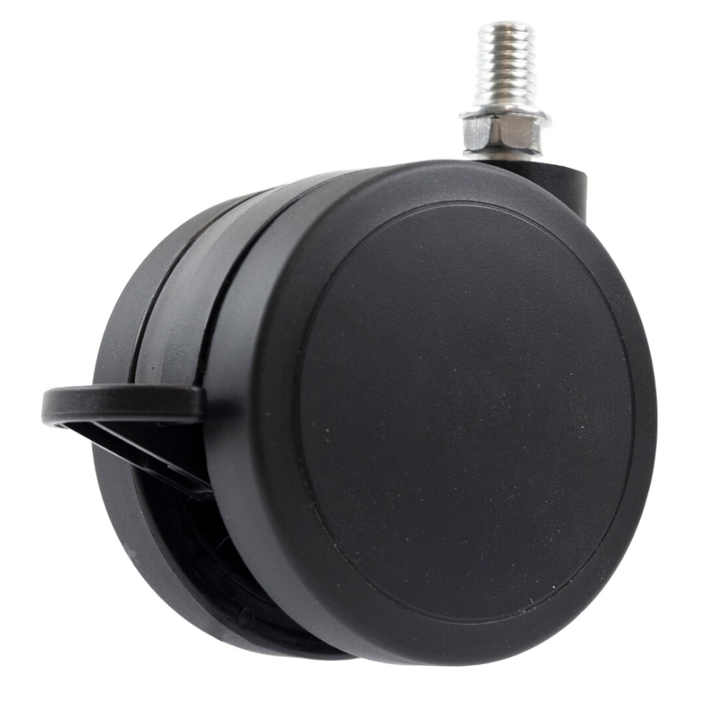 Svängbart dubbelt möbelhjul. Med gängad tapp M10 och med hjulbroms. Hjul av plast, bana av polyuretan (PUR). Diameter 75mm. Notera! Maxbelastning per hjul 55kg är ett beräknat värde och garanteras inte. Kan även användas till bordsben 511 och 611.