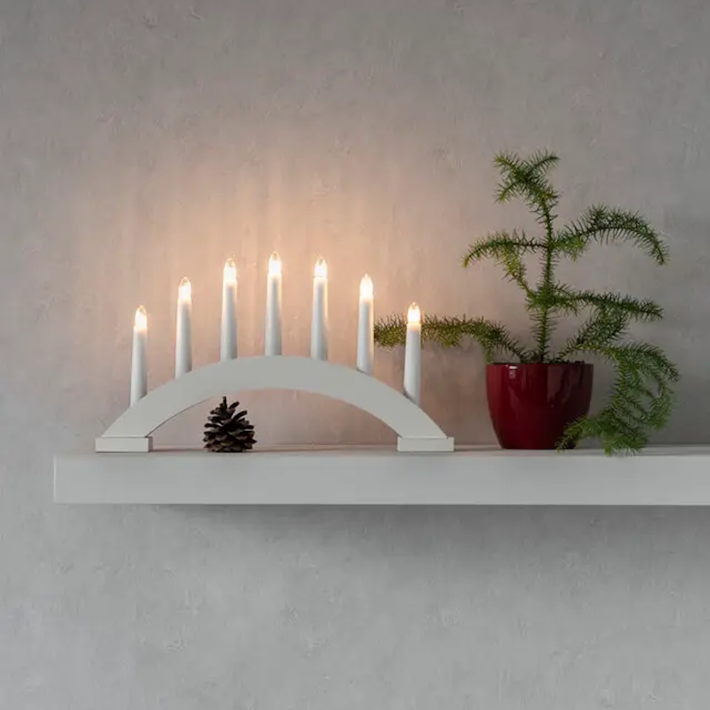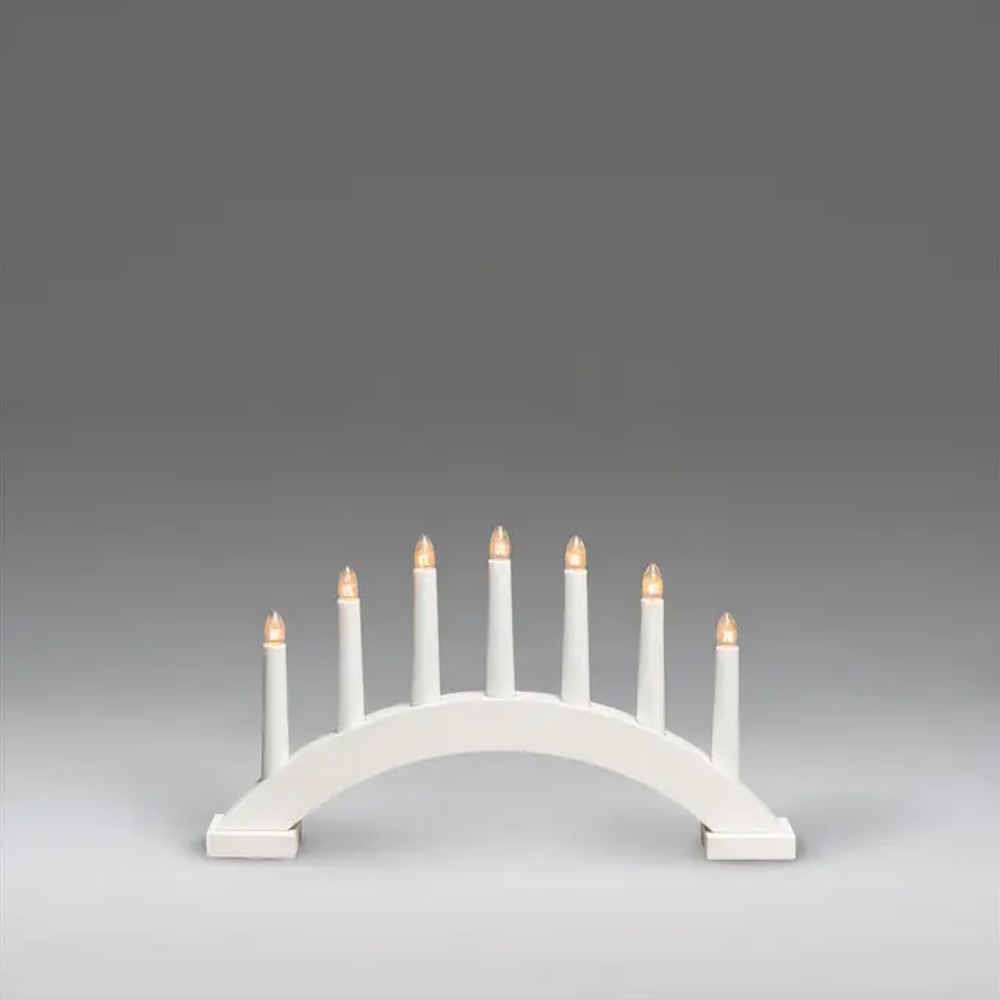 Klassisk 7-armad adventsjustake, båge med varmvita lampor. Vitlackad. Anslutningssladd på 1,7 meter. Strömbrytare.