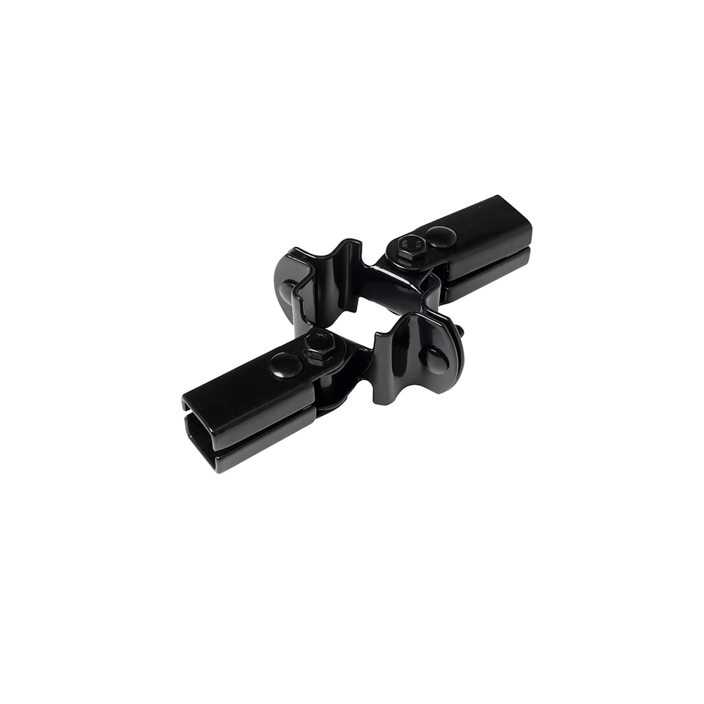 Fäste med justerbar skarv i svartlackad metall. Liknar artikelnummer 34025 men detta fäste har en mer flexibel funktion. Alla våra tillbehör till metallstaket och grindar är galvaniserade, zinkgrundade och färdigmålade i svart pulverlack.