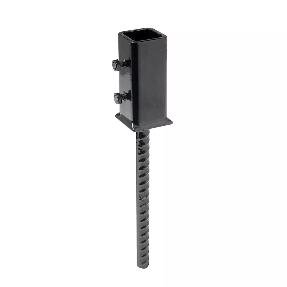 Stolpfäste i svartlackad metall att förankra våra metallstaket och grindar i mark under jord.