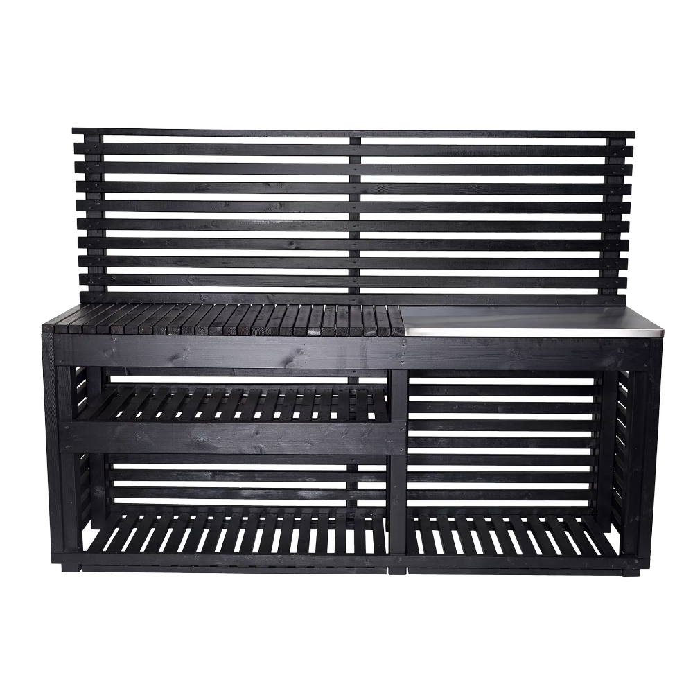 Utekök Horizont Premium svart med rostfri bänk och trä bänk.