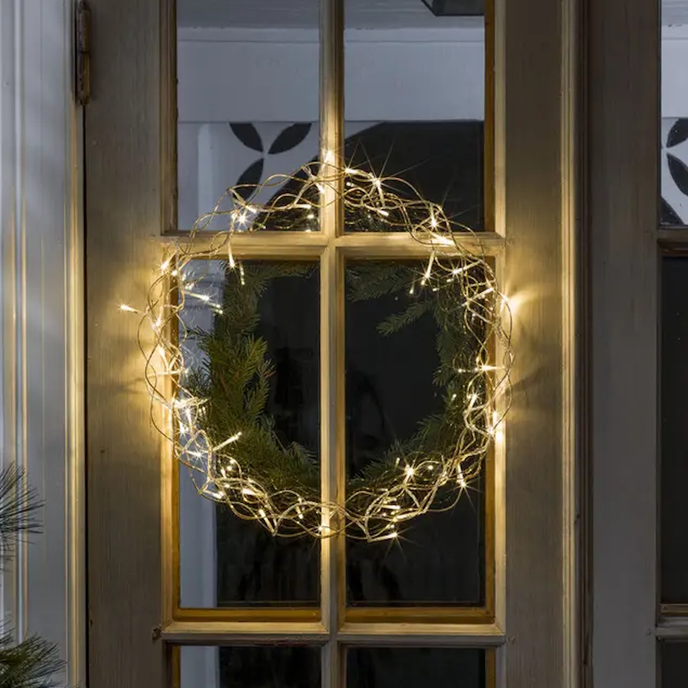Guldfärgad girlang bestående av 48 LED-lampor som ger en varmvit ljusfärg. Girlangen har en diameter på 450mm och en 5m lång anslutningskabel.