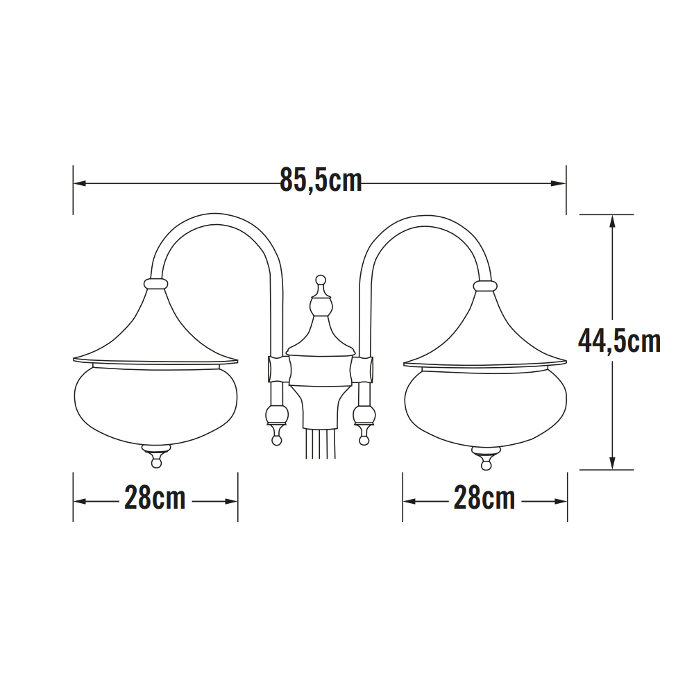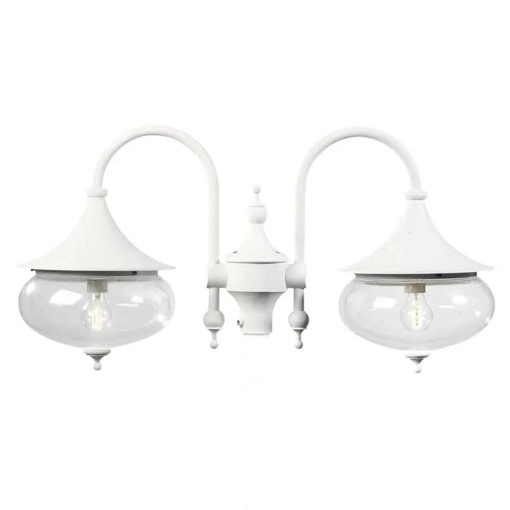 Romantisk och tidlös utomhuslykta med två armar, perfekt för att ge en inbjudande ljusbelysning vid uppfarten, trädgården eller gången. Armaturen är tillverkad i matt vitlackad aluminium med klara akrylglas. Den är IP23-klassad, vilket innebär skydd mot lätt regn och vattenstänk, idealisk för husets fasad eller terrass under takutsprång. Produkten levereras utan stolpe och utan ljuskällor, vilket ger flexibilitet att välja egna lampor och stolpe.