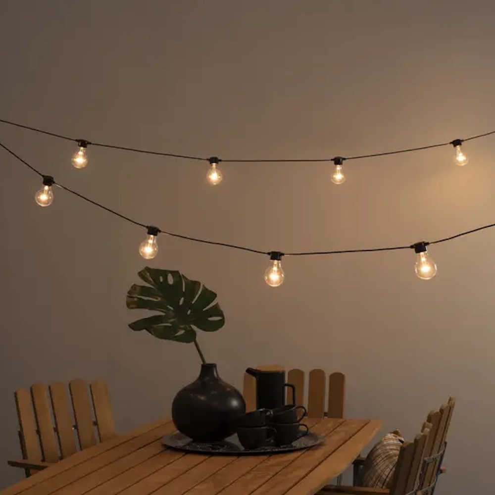 Stämningsfull partyslinga med 10 amberfärgade LED-lampor som sprider ett varmt, mysigt sken. Utrustad med dimmer och 50cm lampavstånd – perfekt för att skapa rätt atmosfär både inne och ute.