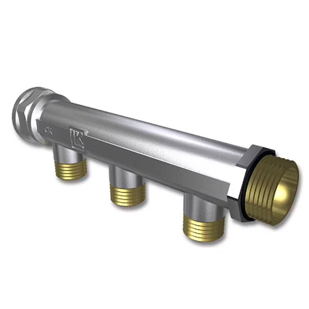 Påbyggnadsbar fördelare för värme- och tappvattensystem. Monteras på vägg eller tak i LK Fördelarkonsol eller i LK Fördelarskåp UNI. Tillverkad av blyfri avzinkningshärdig mässing, förnicklad. Ersätts med ny modell och nya artikelnummer under 2026. Fördelare UNI 1-G15, 2-G15, 3-G15, 4-G15 och 5-G15 har anslutning G20 (inv- och utv-gänga EuroCone) för matningsledning och anslutning G15 c/c 50 mm utv gg Conex/EuroCone på avsticken. Samtliga typer har o-ringstätning på den utvändiga G20 sidan för matningsledning vilket underlättar ihopmontering av 2 st fördelare utan ytterligare tätning. Rör X16, A16, X20 samt A20 kan anslutas på avsticken med LK PressPex Pressanslutningskoppling.