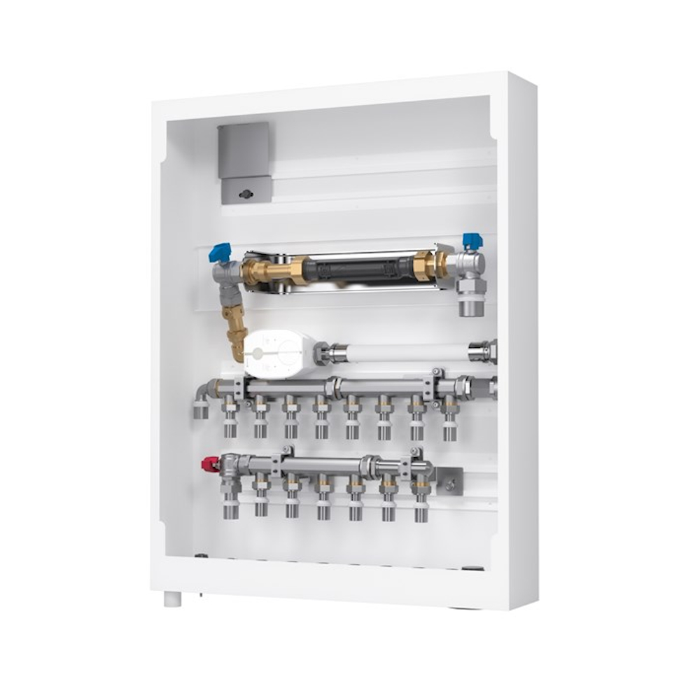 Det levereras komplett med erforderliga skåpsgenomföringar för både matnings- och kopplingsledningar (tomrörsdimensioner: 1 st diameter 50mm, 14 st diameter 25mm, 2 st diameter 32-34 mm). Det ingår även 14 st LK Pressanslutningskoppling AX16xG15 för kopplingsledningar, samt uttag för AX20 för matning till och från VVB. Samtliga fördelare, kopplingar samt kulventiler är av avzinkningshärdig mässing. Skåpet har vattentät botten med 50 mm hög framkant och är godkänt enligt NT VVS 129. Skyddspåse att trä över skåpet under byggtiden ingår. Skåpet monteras på min. höjd 300 mm från undersida skåpsbotten till färdigt golv.