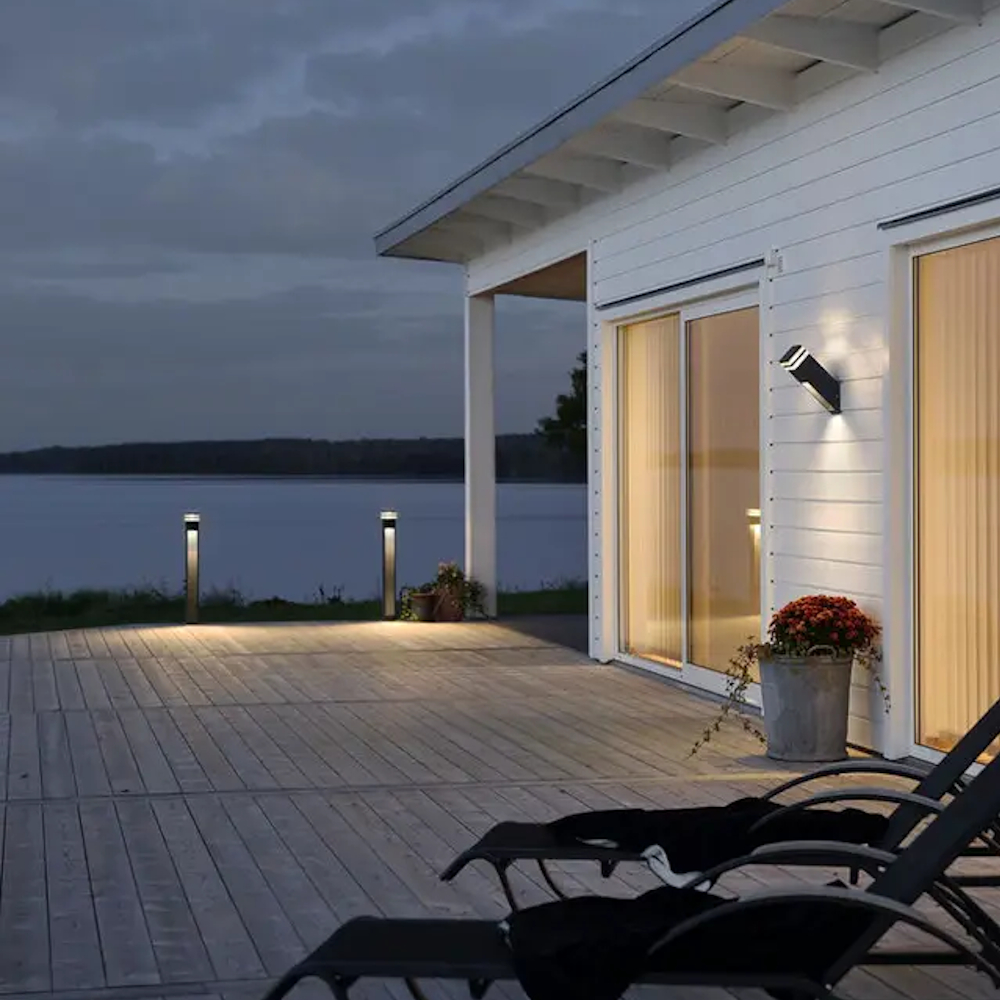 Fasadbelysningen Massa i mörkgrå lackad aluminium med klart polykarbonat glas. Integrerad LED på 2x8W. Motsvarande 800 Lumen.