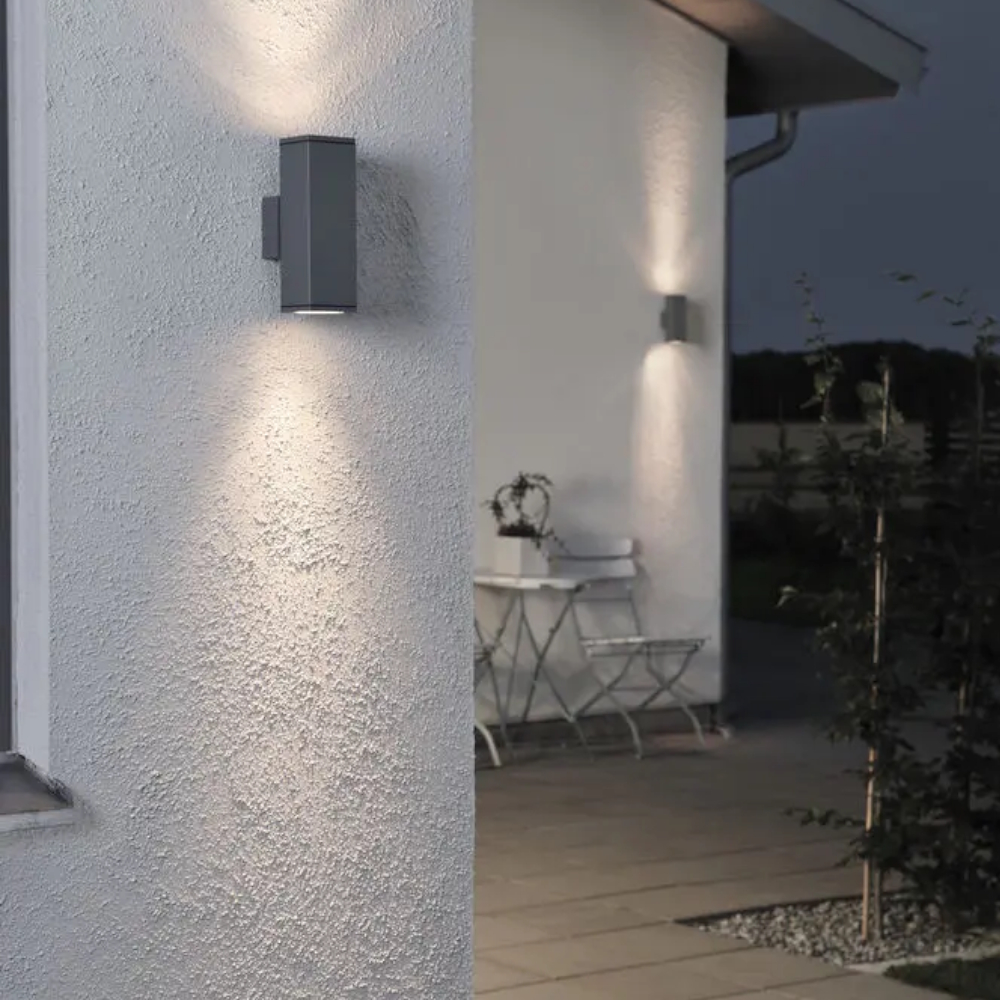 Monza fasadbelysning i antracitgrå lackad aluminium, den är kvadratisk i formen och lyser både upp och ned, GU10 sockel för max 2x35W.