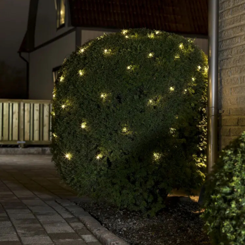 Ljusnät med 40 st varmvita LED-lampor. Kommer med sensor och timer på 6 och 9 h. Drivs med 4 st AA-batterier (ingår ej!). För utomhusbruk.