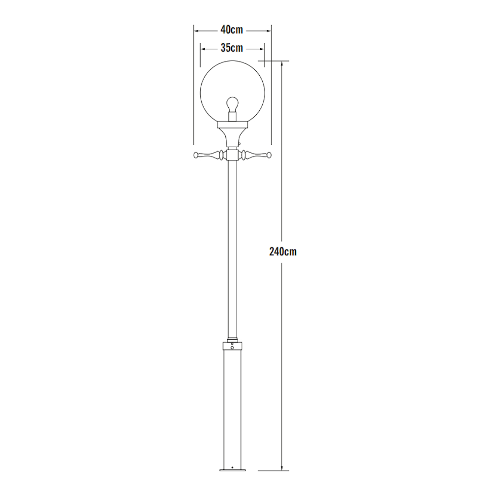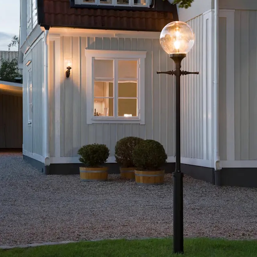 Orion lyktstolpe 240cm i svartlackad aluminium med klart glas en stilren och hållbar utomhusbelysning för trädgård, uppfart eller entré. E27-sockel, max 100W. Stolpe medföljer.
